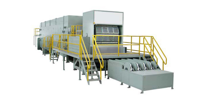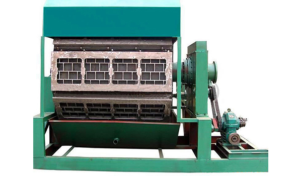Cette machine de moulage pour pâte à papier possède un tambour de moulage rotatif octaédrique. Des tuyaux d’arrivée et de sortie d’air situés sur chacun des 8 côtés se connectent à la base de moulage et aux moules ainsi qu’à la canalisation principale via un mécanisme à soupape. Le moule de formage papier et la plaque de transfert sont entraînés par un moteur à vitesse variable et un réducteur. La plaque de transfert entraîne le bras mécanique pour mettre en œuvre un mouvement alternatif à 90° par le biais d’un réducteur.